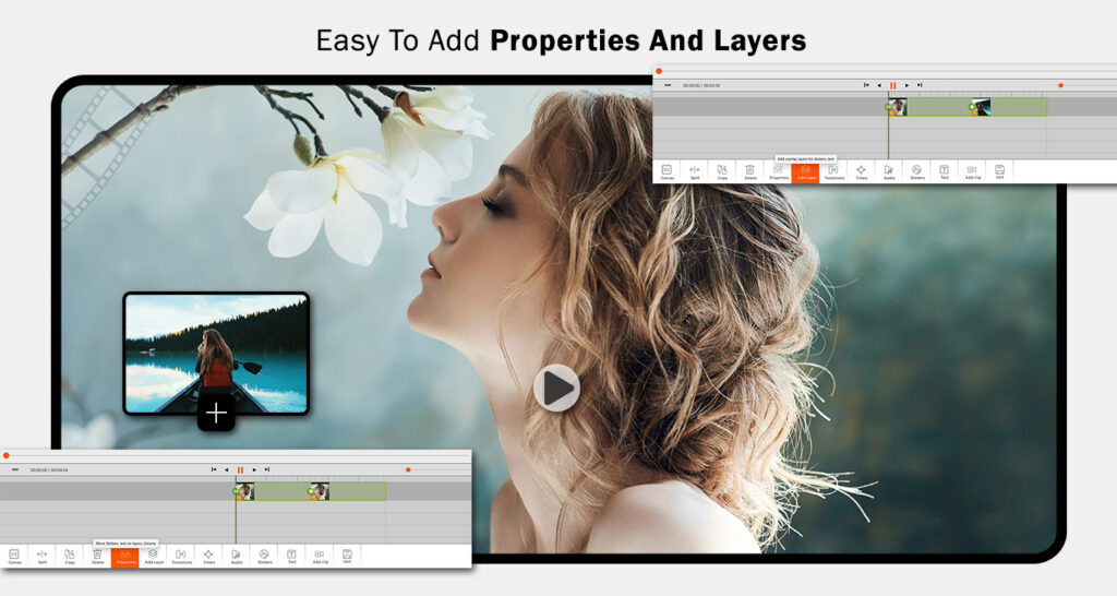 Step 6:- Utilize the “Properties” option to move, apply stickers, add text on layers, and adjust volume in your video clip creation. Easily position your text and stickers in real-time duration on your video clip.