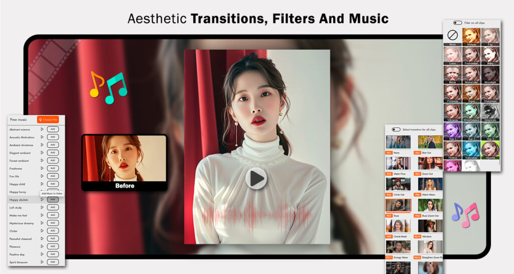 Video Editor and Short Video Maker” is a free video editor, photo movie maker, and slideshow maker – the only full-featured professional video editor for Windows. It supports multiple layers of video, images, and text, allowing for precise cutting and trimming, multi-track audio, color filters, and much more. The application provides features such as video trimming, joining, adding background music, and text captions. Additionally, it offers more advanced options like image filters and transition effects. Below are some of the features that the application offers: